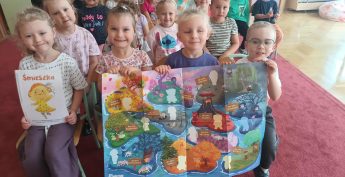 Dzieci z grupy III realizowały projekt edukacyjny „Czuciaki z Krainy Emocji”, poznając Śmieszkę z Wyspy Radości.